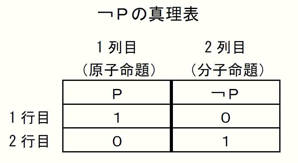 確認のためもう一つ、否定子¬「否」の真理表を掲げておく。以下のように¬Pの列の真理値を縦に01と配置させることで¬が定義されている。命題Pに加えられた¬は、元の命題の真偽を逆転させる働きを持つということである。