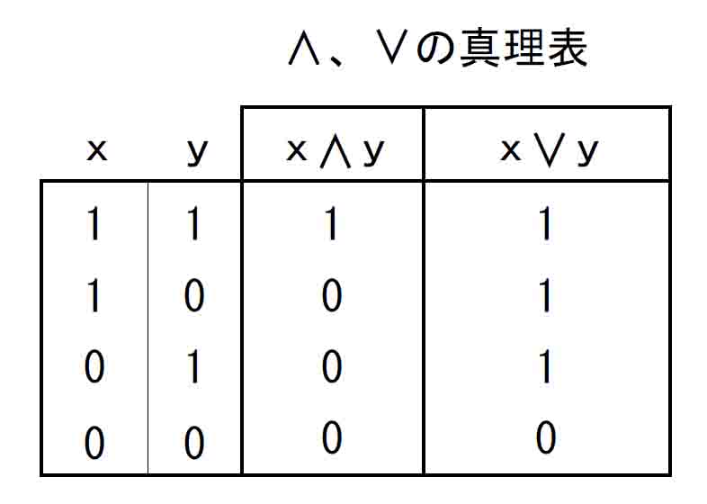 すなわち、∧の真理値というのはxとyの真理値のうち小さい方を採用したものであり、∨の真理値はxとyの真理値のうち大きい方を採用したものだということである。